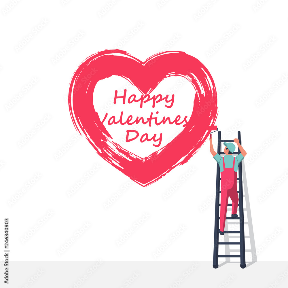 Artist On The Stairs Draws Big Red Heart On Wall Grunge Stroke Symbol Of Love Greeting Cards For Valentine S Day Painted With Brush Vector Illustration Flat Design Isolated On White Background Stock